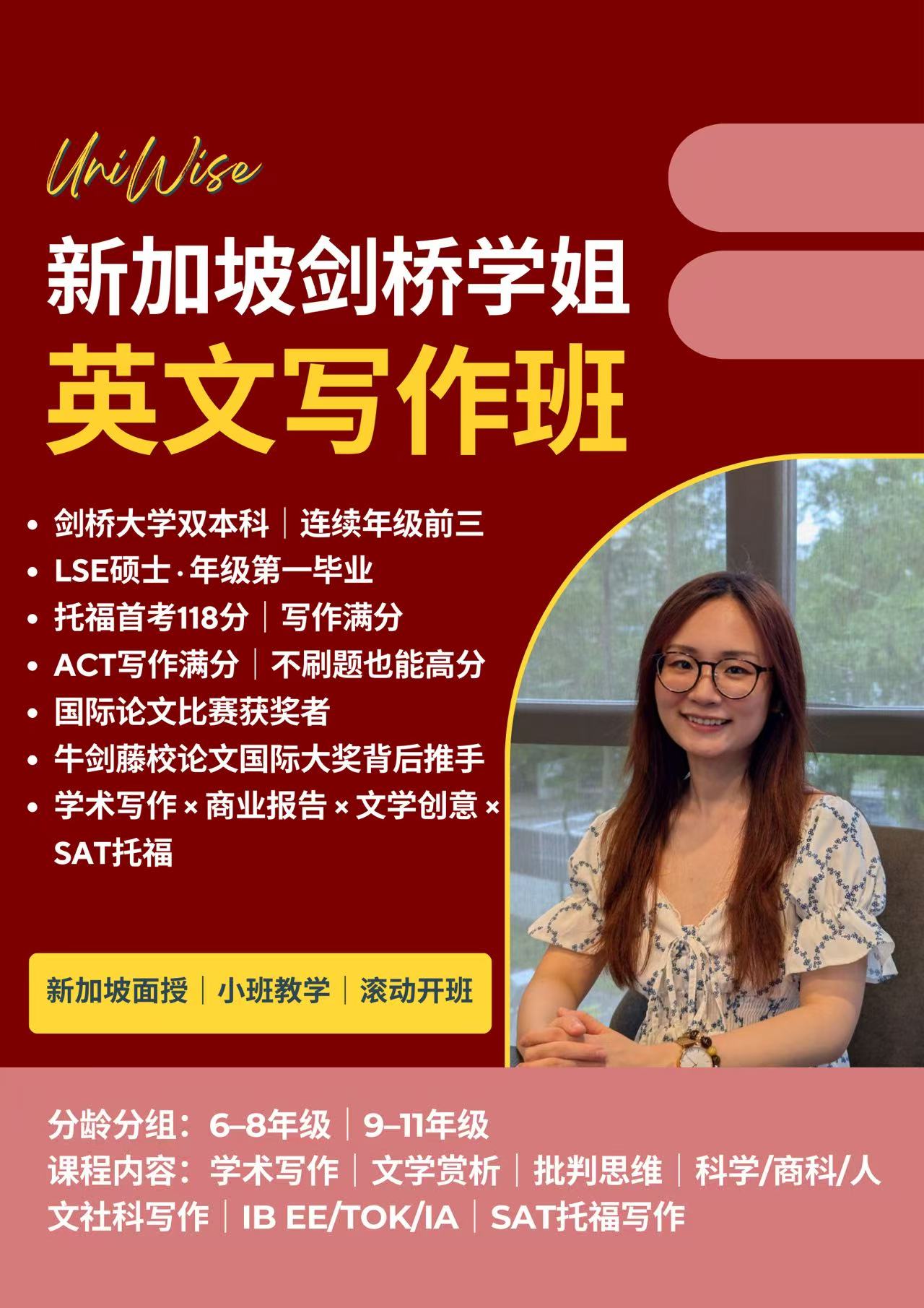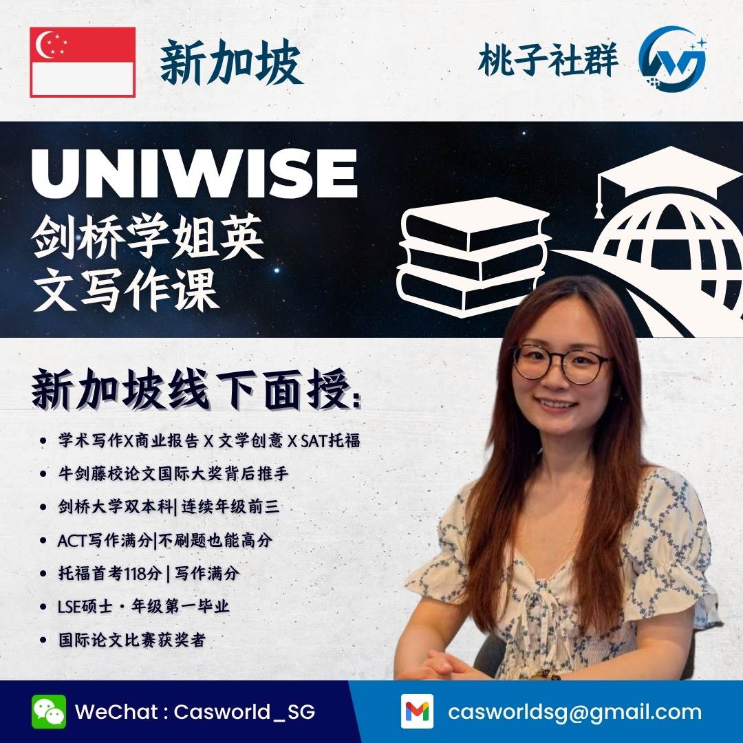 如果您的孩子正在为英文写作发愁,或渴望在IB、SAT、托福等考试中取得佳绩,桃子社群推荐由剑桥学姐Wendi亲自设计,亲自教授,亲自批改指导的精品小班英文写作课,适合新加坡6–11年级学生。