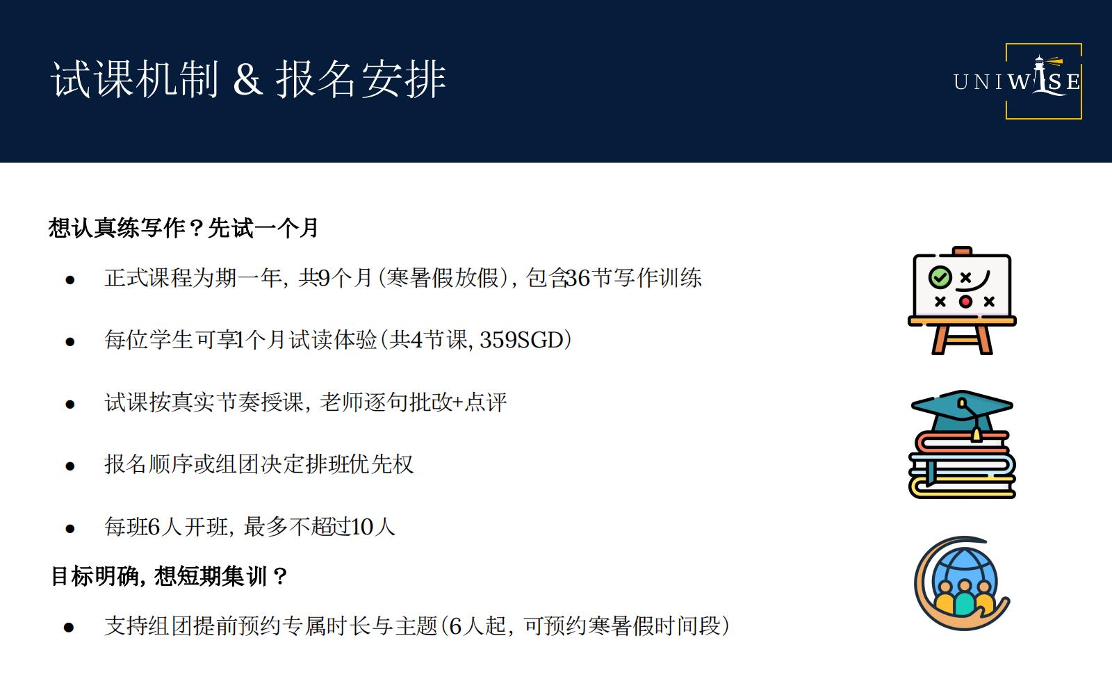 正式课程为期一年,共9个月(寒暑假放假),包含36节写作训练。